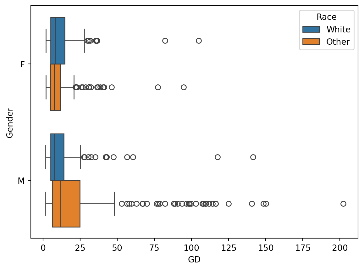 sns.boxplot(data = dt, x = "GD", y ="Gender", hue="Race")