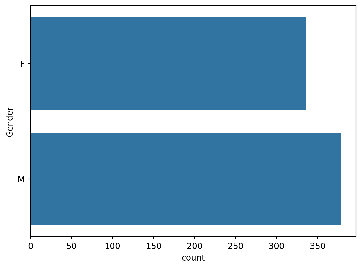 The result of .value_counts() tells us that the users guessed the age of 378 images of men and 336 images of women. This is what we call a frequency table. A very common visualization of a frequency table is a bar chart. The height (length if it is horizontal as in the example here) of the bars in this figure represent the frequency of each category.