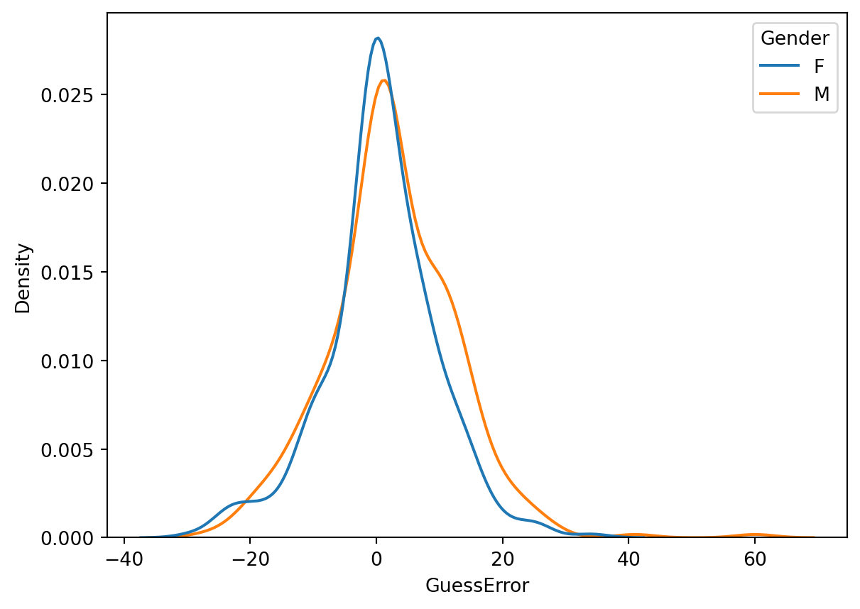 We can count how many times each value appears in a column using the value_counts method. For example, let’s count the number of guesses for men and women in the dataset.