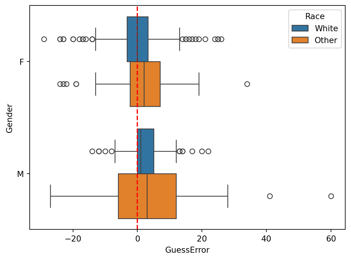 The comparison of the distributions of guess durations by both gender and race shows that the guess durations were most dispersed for non-white men. Furthermore, the median guess duration (line inside the box of the boxplot) was the longest for this group. This may indicate that the participants were more uncertain about guessing the age in this group and took longer to think about their guesses.