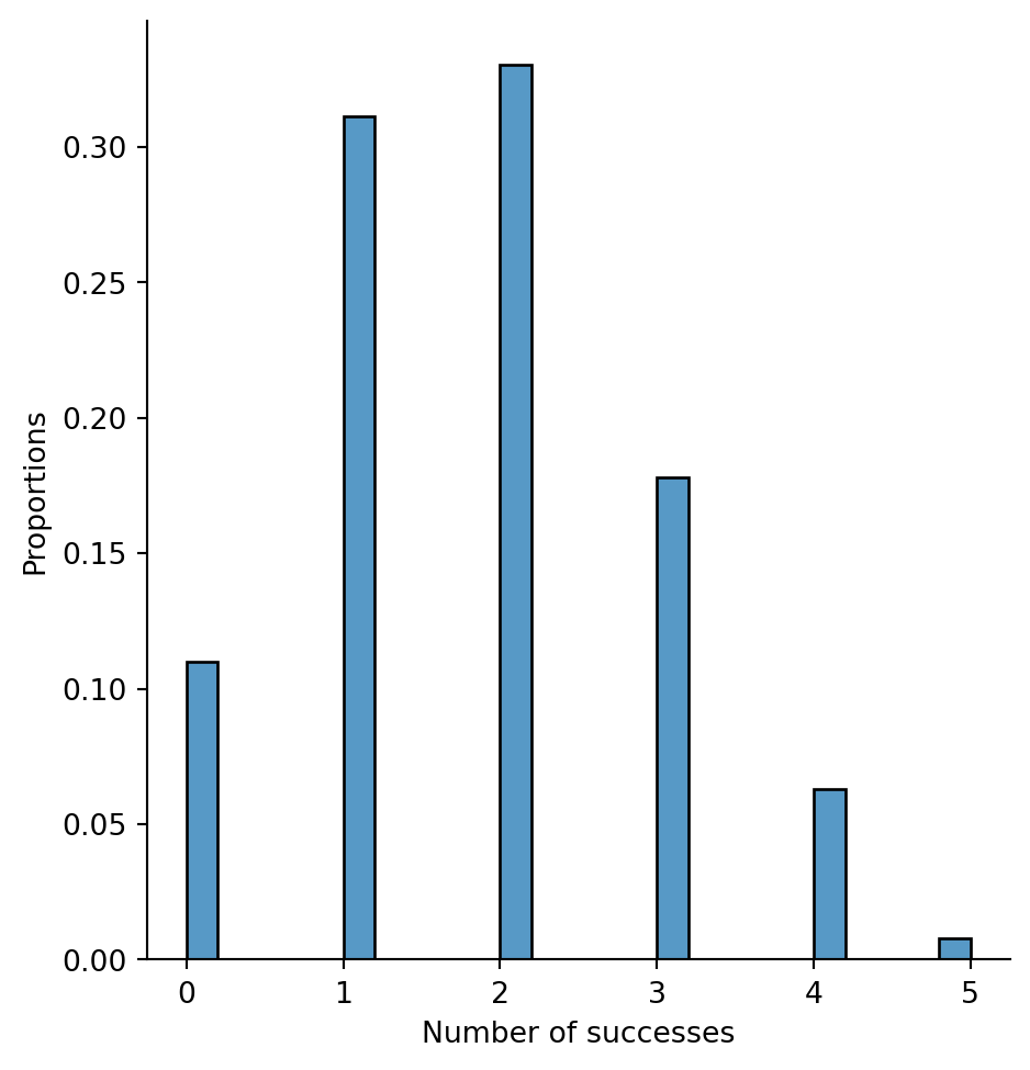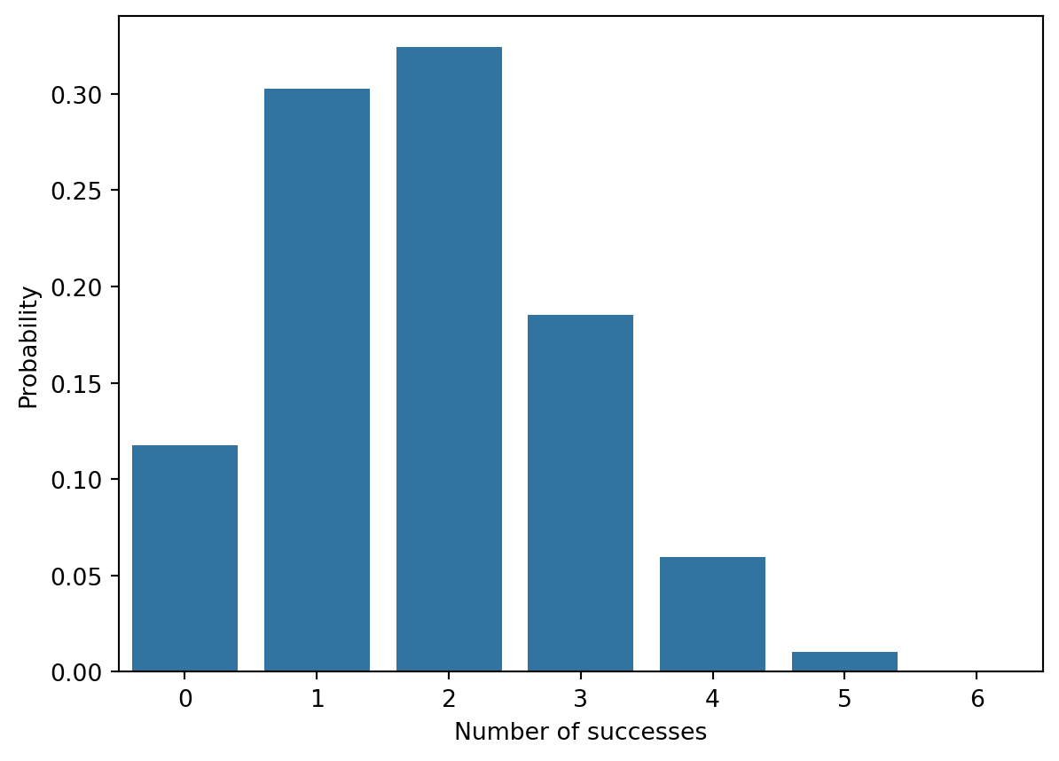 #| caption: Empirical probability mass function of the binomial distribution with parameters n=6 and p=0.3.