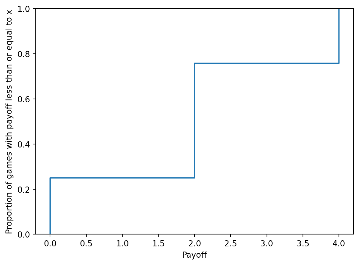 plt.ylabel('Proportion of games with payoff less than or equal to x')Text(0, 0.5, 'Proportion of games with payoff less than or equal to x')