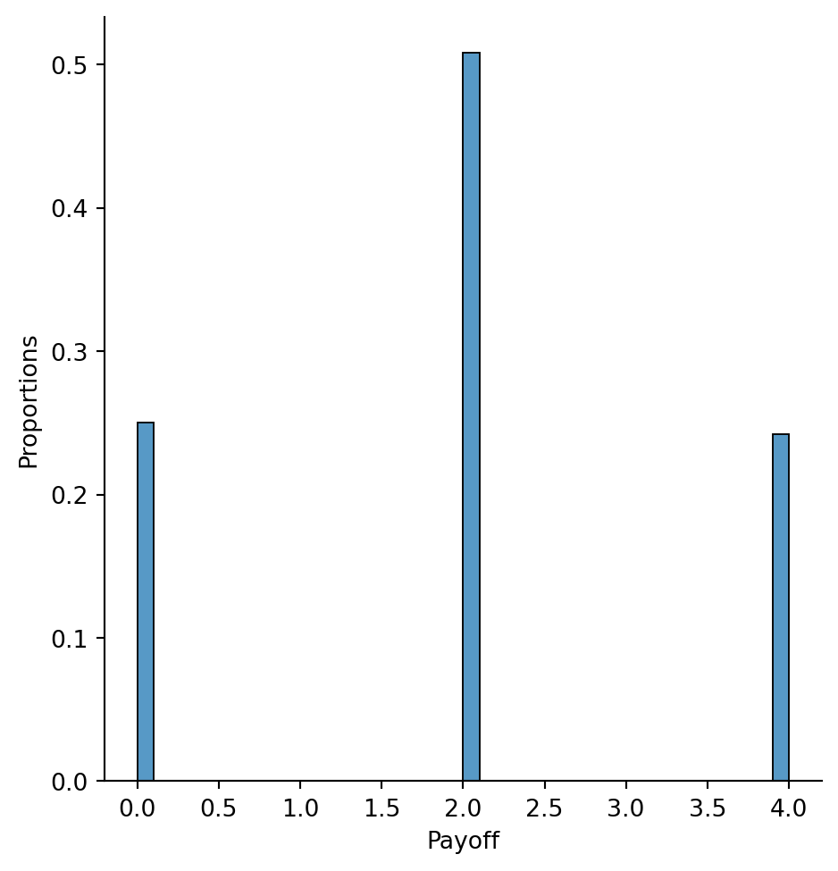 payoff = 2 * np.sum(coins_game, axis=1)sns.displot(x=payoff, stat='probability')