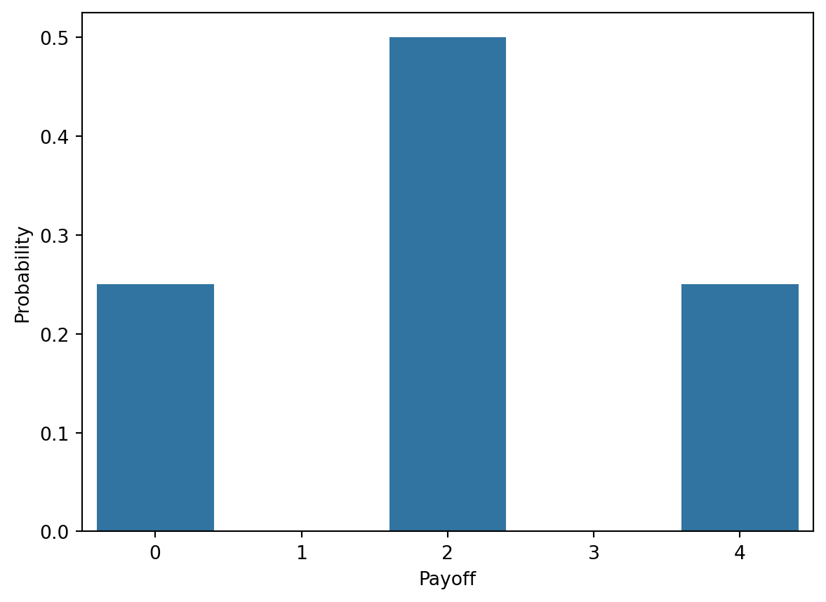 If we equip the sample space with a probability model, we can compute the probability of winning 0, 1, or 2 EUR. Let’s assume that the outcomes are equally likely (our probability model), so that the probability of each outcome in \Omega is 1/4. Then the probability of winning nothing is