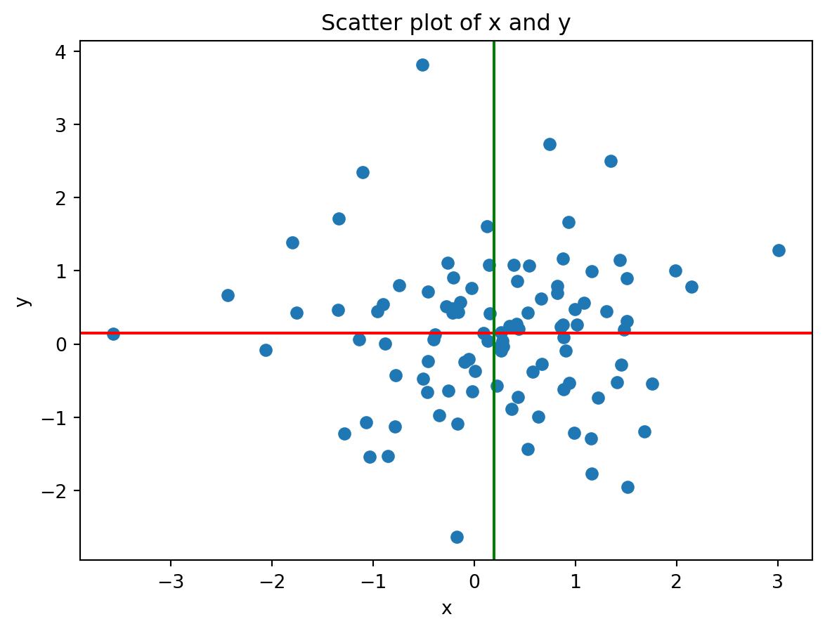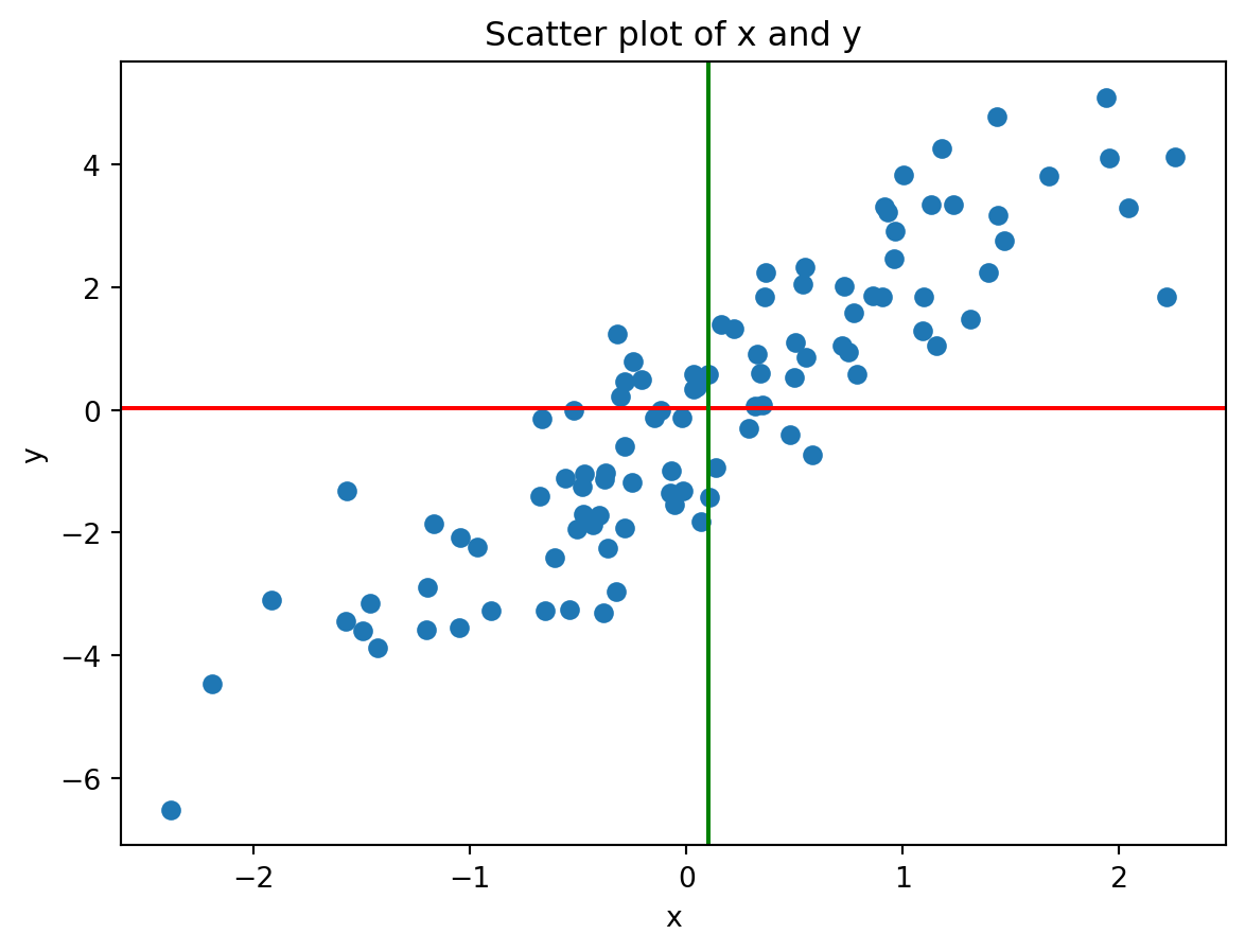 # Generate some data (negative linear relationship)x2 = np.random.randn(100)y2 =-2* x2 + np.random.randn(100)print("Sample mean of x:", np.mean(x2))print("Sample mean of y:", np.mean(y2))print("Covariance matrix of x and y:\n", np.cov(x2, y2))# Plotplt.scatter(x2, y2)plt.axhline(y = np.mean(y2), color='red')plt.axvline(x = np.mean(x2), color='green')plt.xlabel('x')plt.ylabel('y')plt.title('Scatter plot of x and y')