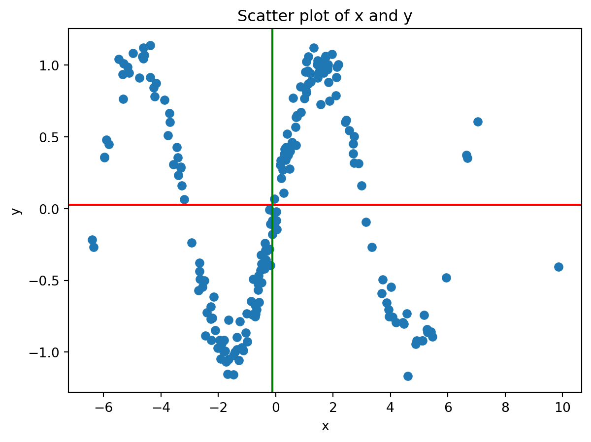 # Generate some data (quadratic relationship)x4 = np.random.randn(200) *3y4 = np.sin(x4) + np.random.randn(200) *0.1print("Sample mean of x:", np.mean(x4))print("Sample mean of y:", np.mean(y4))print("Covariance matrix of x and y:\n", np.cov(x4, y4))# Plotplt.scatter(x4, y4)plt.axhline(y = np.mean(y4), color='red')plt.axvline(x = np.mean(x4), color='green')plt.xlabel('x')plt.ylabel('y')plt.title('Scatter plot of x and y')